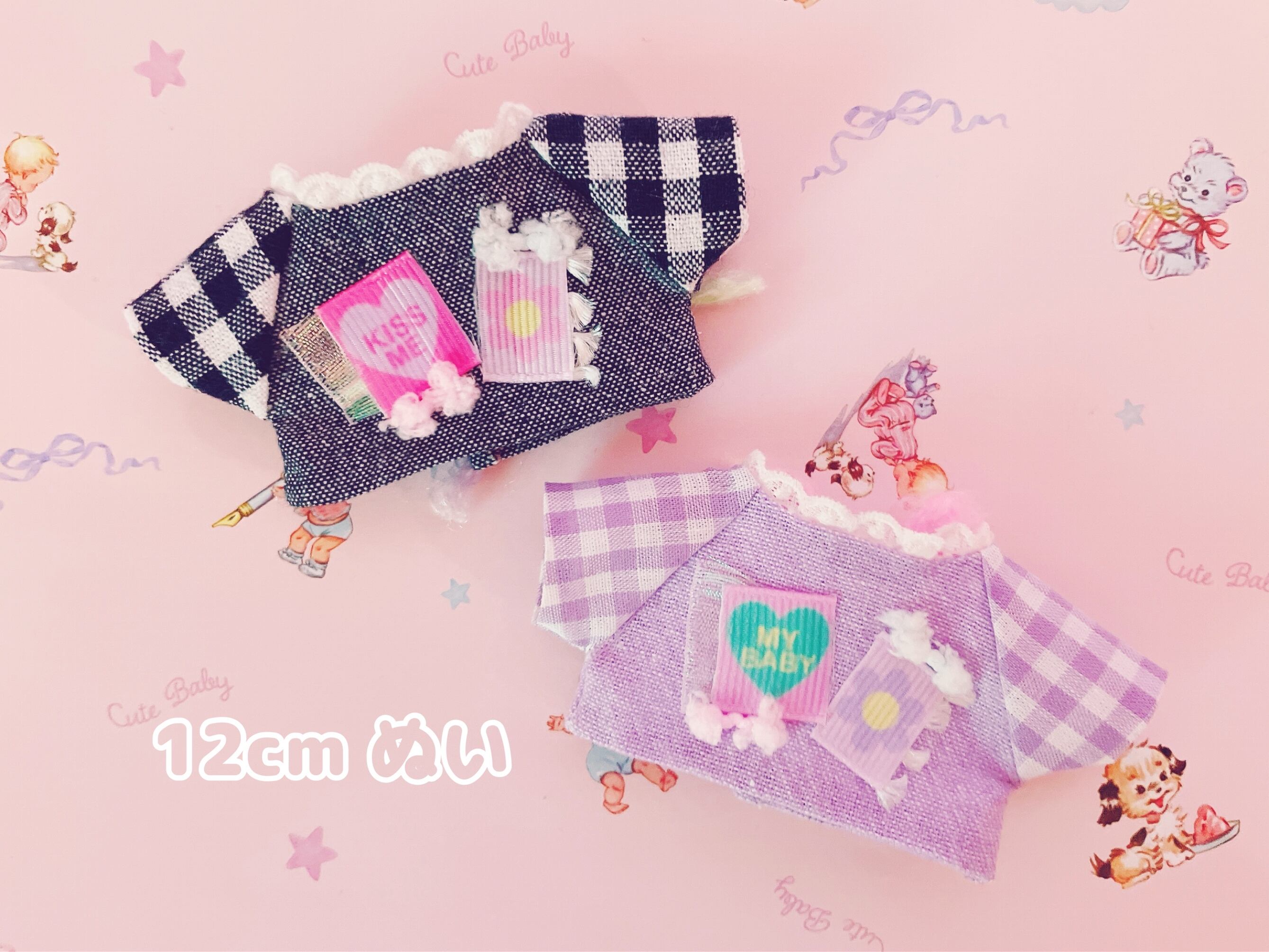・同じデザインのものは全て同じ布、糸、レースで仕上げておりますが、1着1着個体差がございます。 ・手芸用接着剤、ほつれ止め、手縫いで仕上げております。